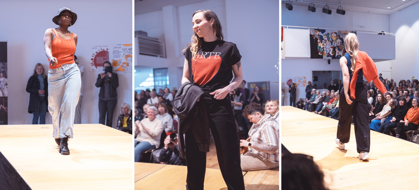 Am Nachmittag ereignete sich das Highlight des Tages: Auf dem Laufsteg im Stadthaus präsentierten vier Ulmer Geschäfte ihre Outfits von fairen und nachhaltigen Labels. Auch wenn die Models keine Profis waren, sorgten sie im Publikum durch ihre ungewohnten Outfits und High Heels für große Bewunderung. Sich so über den Laufsteg zu bewegen, erforderte viel Mut.