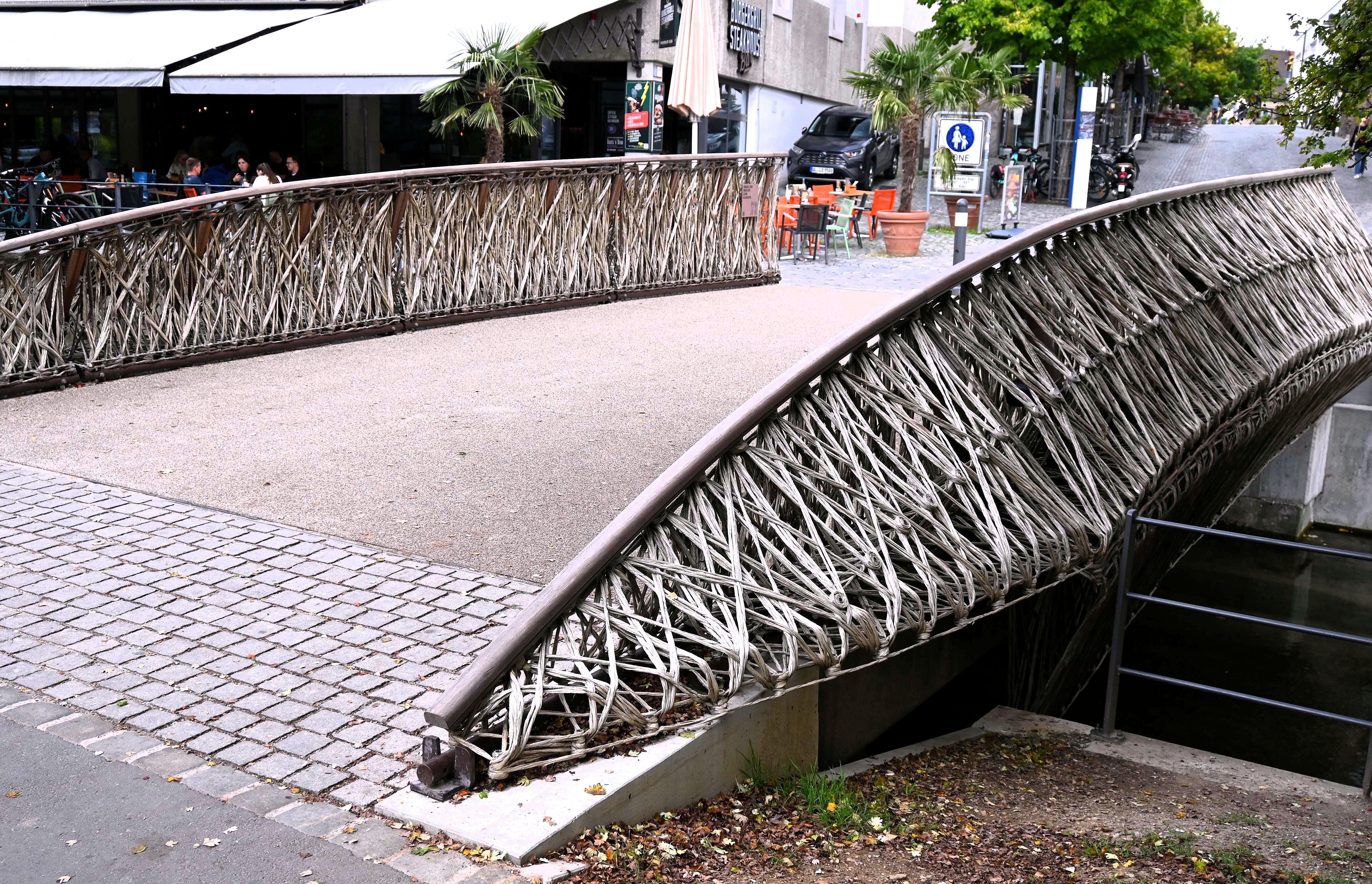 Das gibt es wahrlich nicht oft. Spaziergänger hören beim Gang über die kleine Blau ihre eigenen Schritte und wie die Brücke bei unterschiedlicher Belastung oder Temperaturveränderungen klingt. Möglich wird dies durch 42 Sensoren, die in der Brücke verbaut sind. Sie dienen in erster Linie der Materialforschung für das EU-Projekt „Smart Circular Bridge“ und seinem neuartigen Werkstoff aus Flachsfasern und einem bio-basierten Polyesterharz. Auf Basis der Sensordaten übersetzen die „Klangerfinder“ die Schritte von Passanten in komplexe Klanglandschaften.