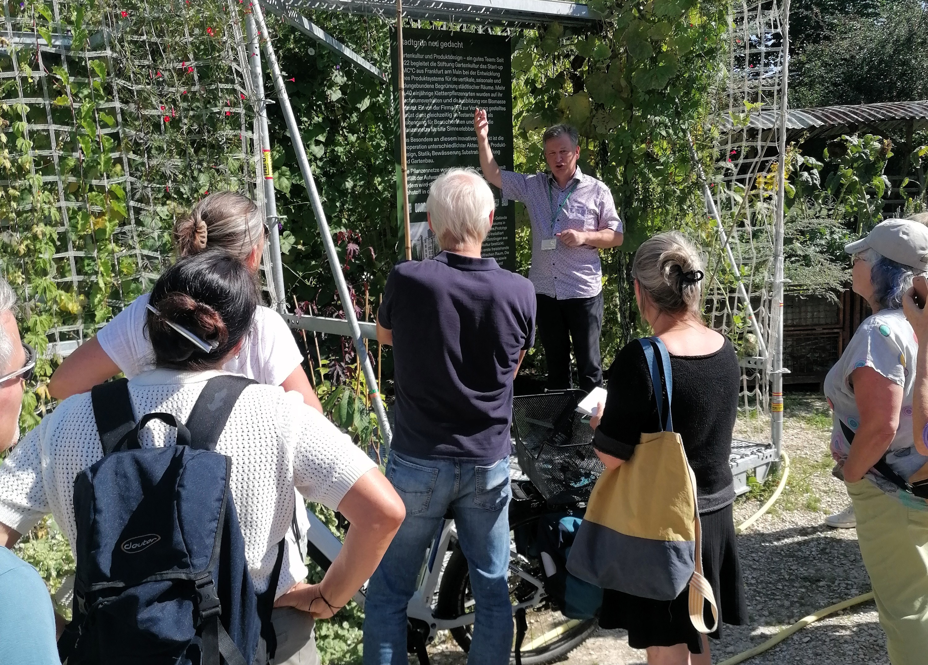 Was hilft gegen die Hitze in den Städten? Der beste Schutz sind schattenspendende Bäume. Doch nicht überall in der Innenstadt ist es möglich, Bäume zu pflanzen, sei es aus Platzgründen oder weil eine temporäre Lösung gefragt ist oder aus anderen Gründen. Eine gute Alternative: Einjährige Kletterpflanzen. Seit 2022 wirkt die Stiftung Gartenkultur in Illertissen an einem Projekt mit erdungebundenen Begrünungssystemen für städtische Bereiche mit. Ziel ist, schnell und flexibel eine Beschattung im städtischen Bereich zu ermöglichen, auch wenn der natürliche Boden nicht genutzt werden kann. Dieses Projekt hat die lokale agenda im Rahmen von „unterwegs in ulm“ nun besucht. Über 40 unterschiedliche einjährige Kletterpflanzen-Sorten werden in dem Projekt auf Wachstumsverhalten und erreichbare Kühleffekte untersucht. Die einen wachsen schnell in die Höhe, andere bilden buschiges Grün aus. Einige blühen in besonders schönen Farben, andere wirken durch ihren Duft oder die Grüntöne der Blätter. Dadurch lassen sich geeignete Arten kombinieren, um über die Verschattung hinaus auch ästhetische Effekte zu erzielen oder gezielt zur Biodiversität beizutragen. Die Kombination verschiedener Arten reduziert zudem die Anfälligkeit für Krankheiten.